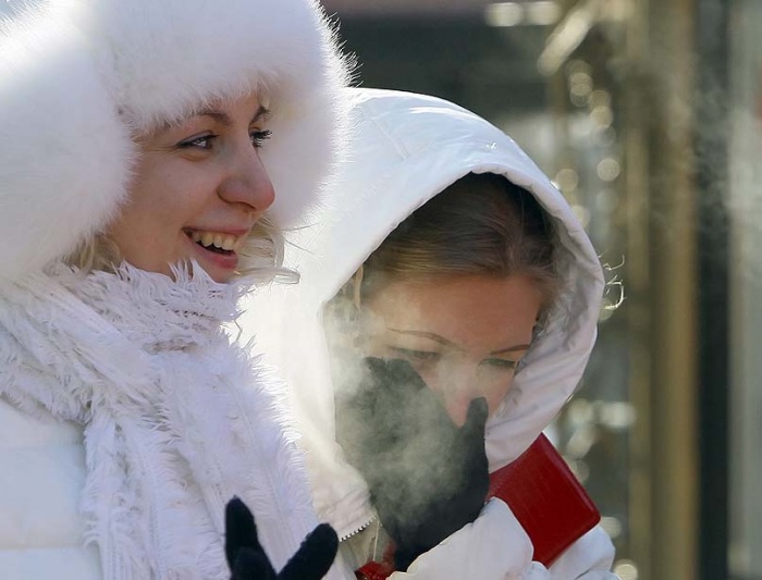 8. Девушки гуляют в центре Киева, укутавшись в теплую одежду. (SERGEY DOLZHENKO / EPA)