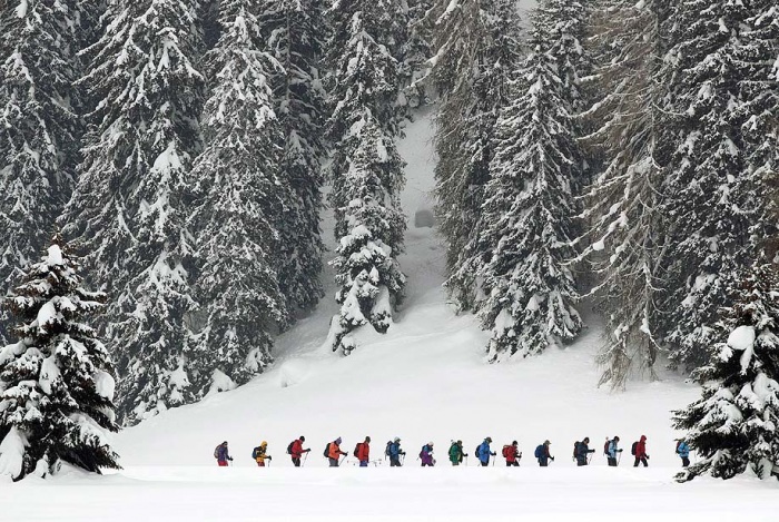 6. Группа туристов на фоне заснеженного пейзажа в Давосе, Швейцария. (ARNO BALZARINI / KEYSTONE)