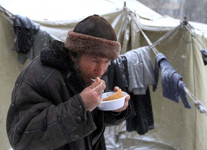 9. Бездомный обедает у палатки с горячим чаем и едой, установленной в Донецке украинскими спасателями. (PHOTOMIG / EPA)