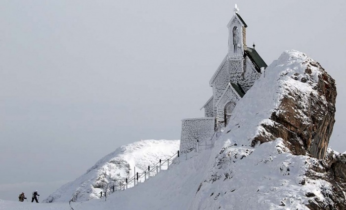 5. Люди поднимаются к заснеженной церкви Вендельштайн в Байришцелле, Германия. Церковь находится на высоте 1828 м. (Matthias Schrader / Associated Press)