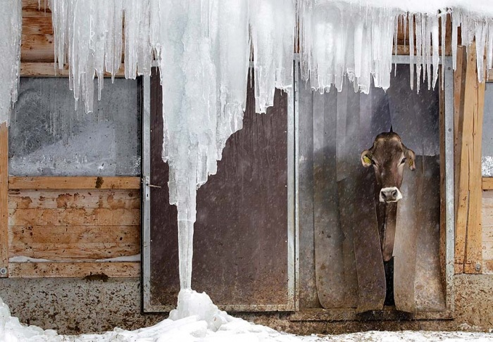 7. Корова выглядывает из стойла в Давосе, Швейцария. (ARNO BALZARINI / KEYSTONE)