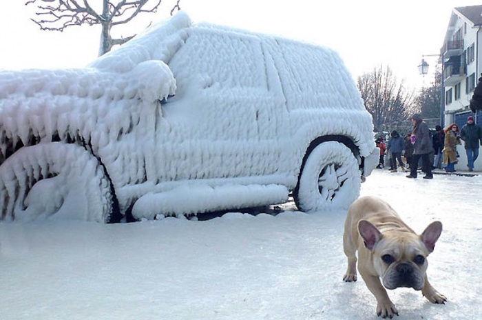 2. Собака пытается идти по льду рядом с замерзшим автомобилем на берегу озера Женева в Швейцарии. (SAUQUET ALAIN/SIPA / Rex Features)