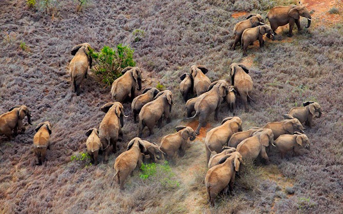 Стадо африканских буйволов в Кении сфотографировано с воздуха.