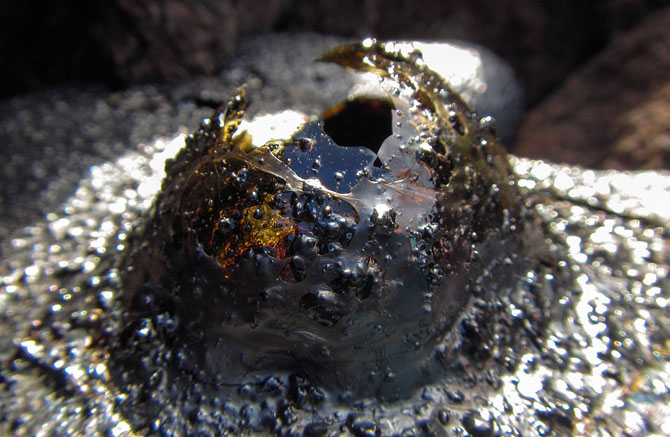 Образовавшийся стеклянный пузырь на потоке из вулкана Килауэа на Гавайях. Обратите внимание на тонкие, прозрачные стенки стеклянного пузыря.