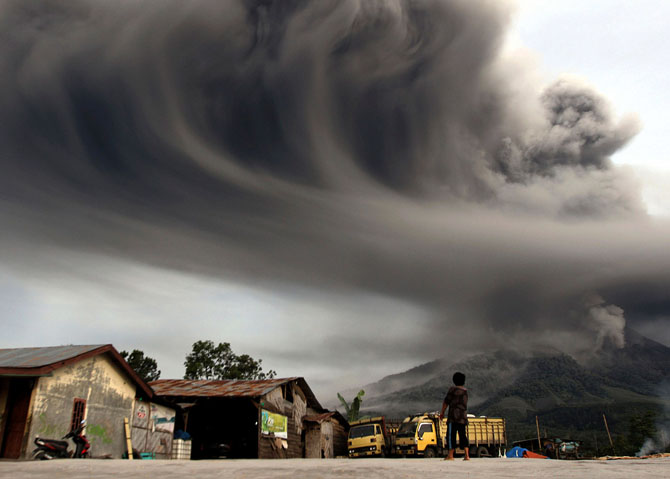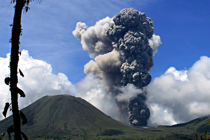 Извержение вулкана Синабунг в северной части острова Суматра, 17 сентября 2013. Столб вулканического пепла и дыма поднялся на несколько километров над вершиной вулкана.