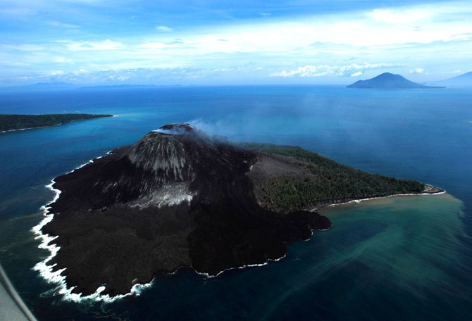Действующий вулкан Кракатау в Индонезии, расположенный на Малайском архипелаге между островами Ява и Суматра. Высота нынешнего вулкана 813 м. До извержения 1883 года вулкан был значительно выше и представлял собой один большой остров. Однако мощнейшее извержение 1883 года разрушило остров и вулкан.