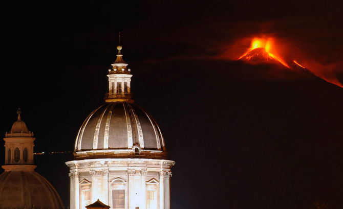 Извержение вулкана Энта, вид из сицилийского города Катании, 28 ноября 2013.