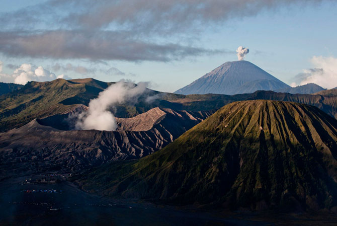 Извержение вулкана Бромо в Индонезии, 23 июля 2013. Является одним из наиболее популярных туристических достопримечательностей в Восточной Яве в силу своей доступности. Кратер Бромо диаметром 600 метров, вулкан находится в состоянии постоянной активности последние 20 лет.
