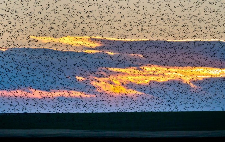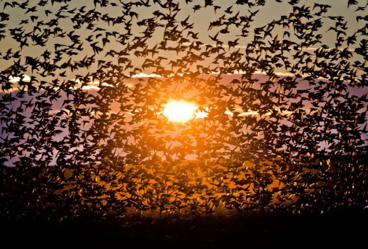 Когда тысячи скворцов собираются в стаи, они двигаются как будто один большой организм, совершая причудливые движения на фоне заходящего солнца.