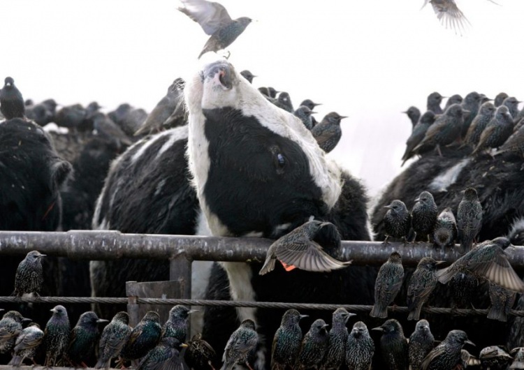 Скворцы в поисках пищи и тепла залетели к коровам в загон, штат Небраска, 18 января 2007.