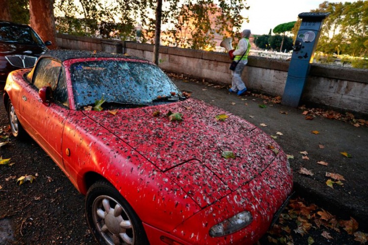 Огромные стаи птиц имеют и свои минусы, особенно для городов. Так выглядят автомобили после «бомбардировки» скворцами. Рим, 8 ноября 2012.