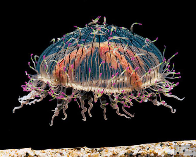 это великолепное существо обитает в глубоких водах Антарктиды и имеет четыре ярких оранжевых щупальца а также белые щупальца. Маленькие белые точки на медузе – это бокоправы. Они живут в медузе, а иногда даже питаются ею.