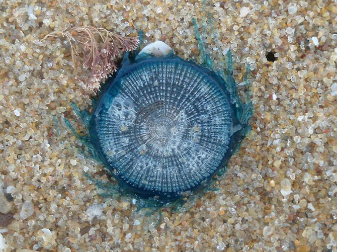 Это не совсем медуза. Более широко это существо известно, как синяя кнопка. Живет порпит на поверхности океана, состоит из двух частей: жесткого поплавка золотисто-коричневого цвета и гидроидных колоний, которые своим видом очень похожи на щупальца медузы. Порпита можно легко спутать с медузой.