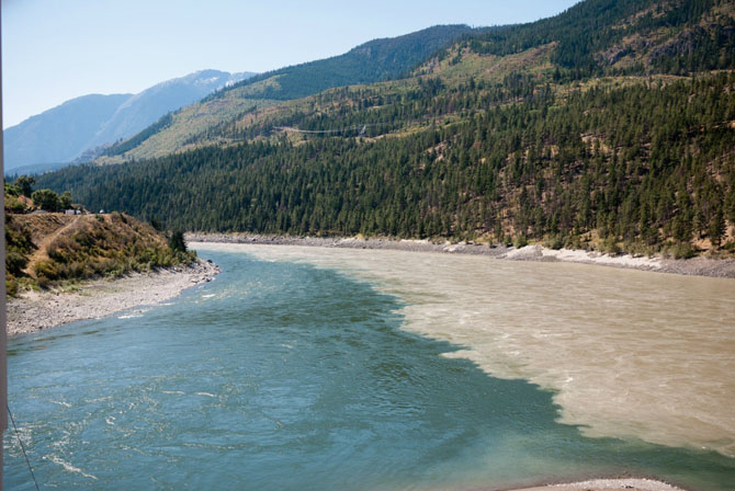 Река Фрейзер подпитывается водами гор и поэтому имеет более мутную воду чем у текущей по равнинам реке Томпсон.