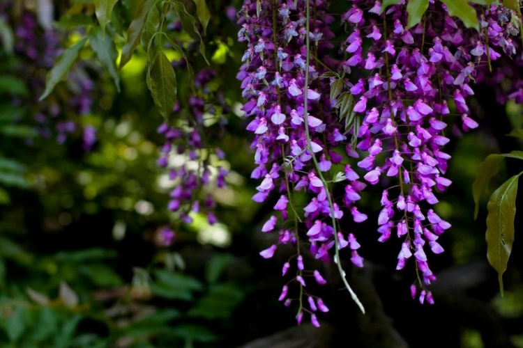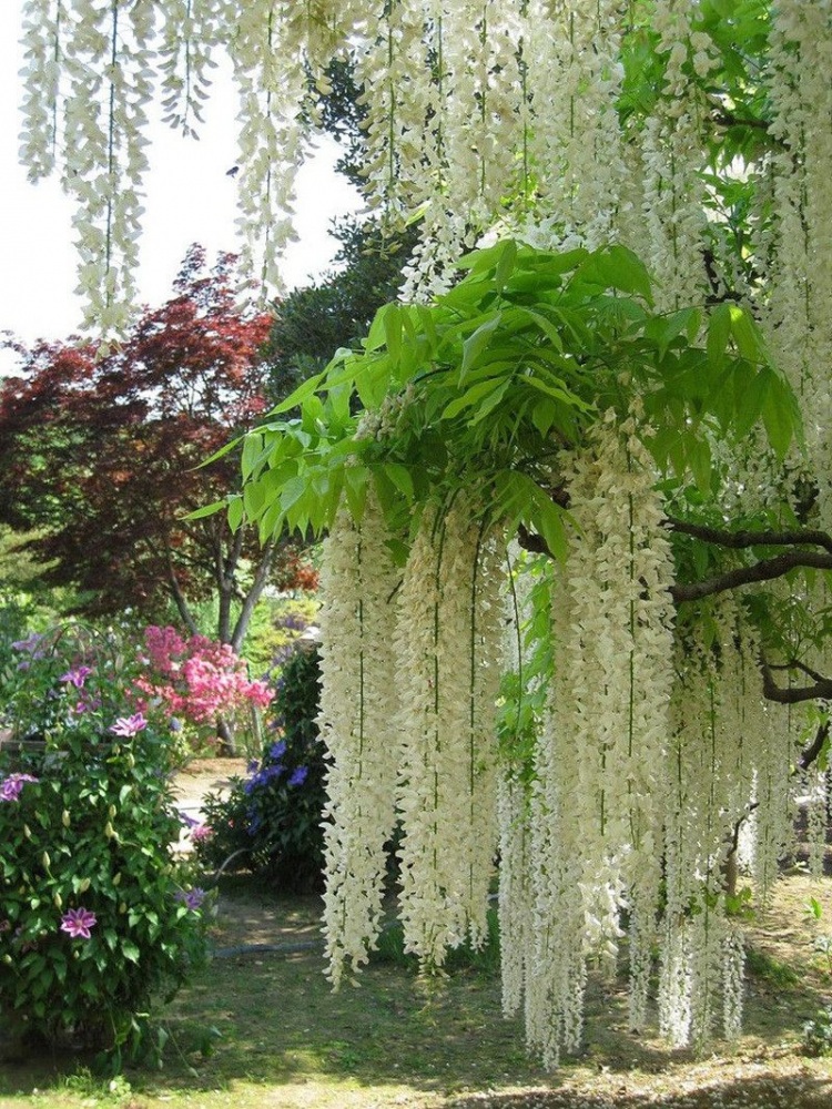 Каждый раз, когда мы думаем о глицинии, сразу вспоминаются ее фиолетовые каскады. Это фиолетовая глициния. Свисающие кисти длиной примерно 40-50 см, каждая из них имеет свой оттенок (фиолетовые, голубовато-фиолетовые, светлые голубовато-фиолетовые), чтобы подчеркнуть их красоту.