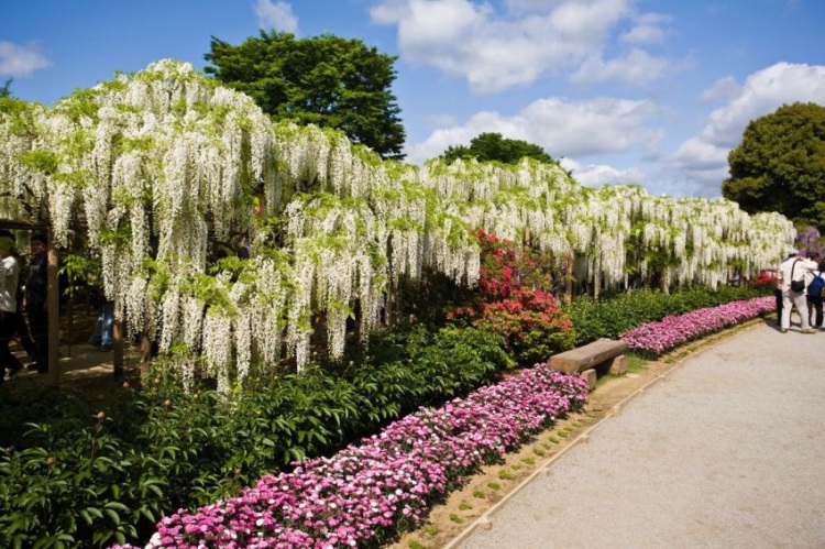 Самое красивое место, по мнению туристов, этого сада – это тоннель из белой Глицинии, который достигает 80 метров! Белые кисти с цветами, нежный и тонкий аромат – хочется, что бы этот тоннель не заканчивался никогда… Не зря японцы называют этот проход «Дорогой счастья».