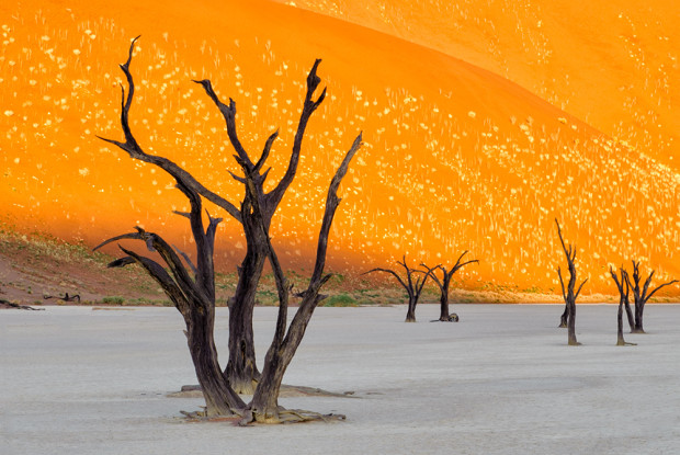Парк «Намиб-Науклуфт» в Намибии — это дом для самых высоких в мире песчаных дюн, некоторые из которых достигают 400 метров в высоту. Деревья в пустыне очень необычные. Сотни мёртвых акаций со скрученными и искривлёнными ветвями были полностью мумифицированы: они окаменели, потому что окружающие условия не позволяли им разлагаться.