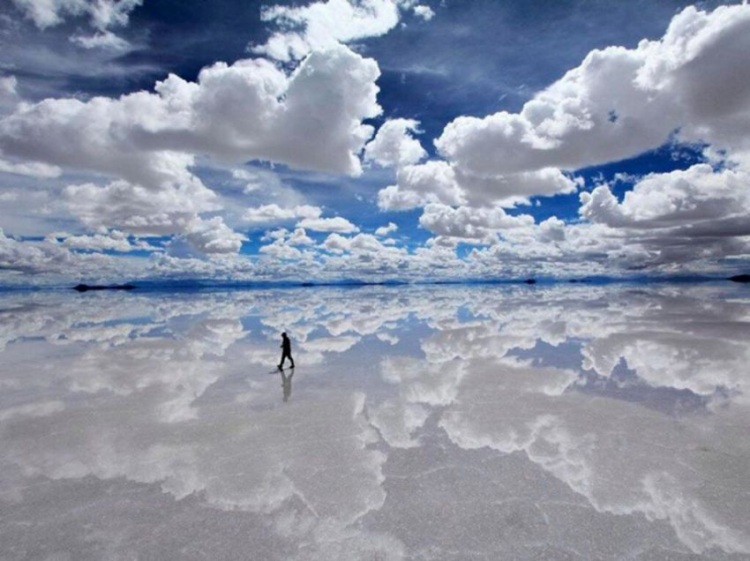 Салар де Уюни — самое большое в мире высохшее соляное озеро. В сезон дождей, с ноября по март, солончак превращается в огромное зеркало: соляные соты покрываются тончайшим слоем прозрачной воды, в которой отражается небо, и становится совершенно непонятно, где же, собственно, горизонт.