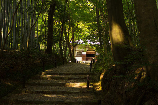 Суб-храм Киото Шорин-ин, храм Хосен-ин сделан из окровавленных досок из замка Фусими (который был подарен в рамках мемориала), и утопает в пышных зеленых садах.