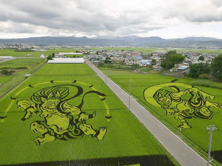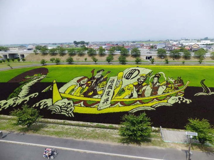 Уже несколько лет в японской деревне Inakadate не просто выращивают рис, но и делают это красиво. Используя различные сорта риса, отличающиеся цветом листьев, там на полях создают настоящие картины. Чтобы все желающие смогли лучше лицезреть это необычный лэнд-арт, рядом возведены высокие смотровые вышки.