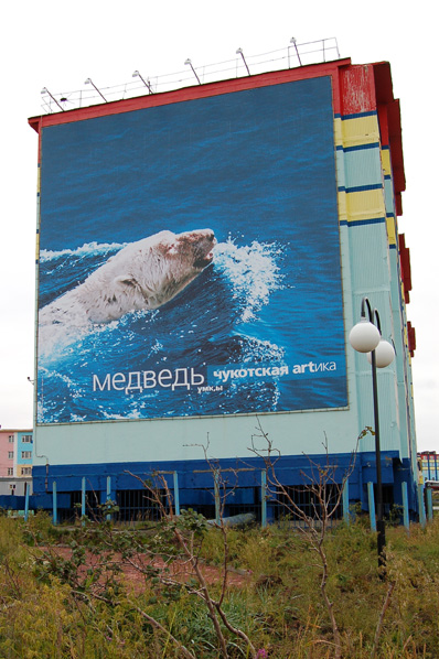 Торцы домов украшены стилизованными плакатами с изображениям элементов чукотской жизни — олени, шаманские бубны, красная икра. Все это называется «Чукотская artика». Чувствуется рука профессионального дизайнера. На каждом плакате наряду с русским названием есть надпись на чукотском языке.