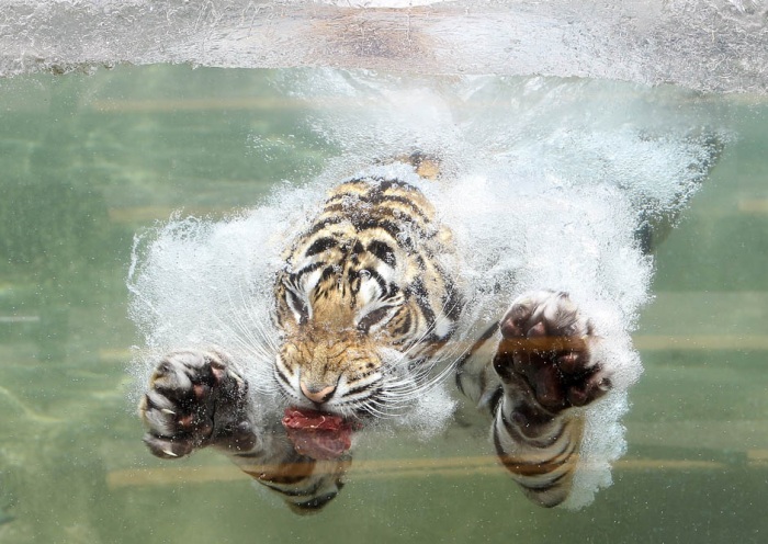 1. Бенгальский тигр по кличке Акаша прыгает в воду за куском мяса в зоопарке Вальехо, Калифорния. (Justin Sullivan/Getty Images)