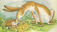- А я тебя - вот так, - усмехнулся большой заяц, да так подпрыгнул, что достал ушами до веток!