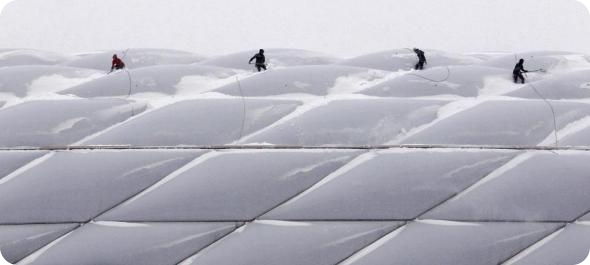 Рабочие с лопатами убирают снег с крыши футбольной арены в Мюнхене. (AP Photo/Matthias Schrader)