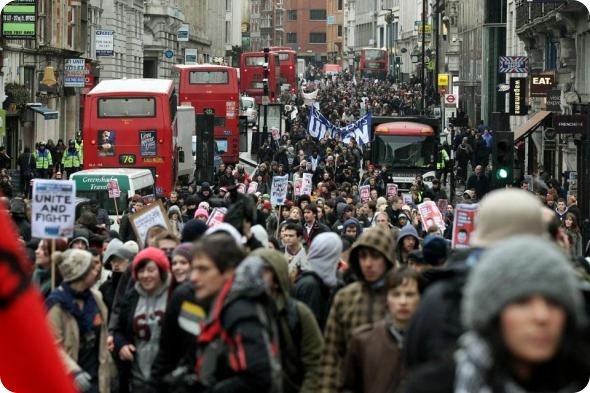 Студенты маршируют по центральной лондонской улице Флит-стрит в знак протеста против сокращений правительством бюджета на образование и увеличения платы за обучение. Уже третий за последний месяц митинг собрал всего несколько тысяч участников. В предыдущих акциях протеста участвовали десятки тысяч. (Photo by Oli Scarff/Getty Images)