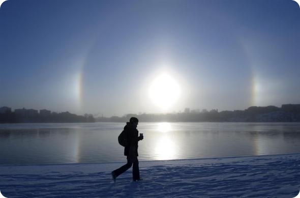 Паргелий, или ложное солнце, в сочетании с гало, над озером Меларен в центральной части Стокгольма 30 ноября. Причина подобного погодного явления – наличие кристаллов льда в атмосфере во время холодной погоды. (Henrik Montgomery / EPA)