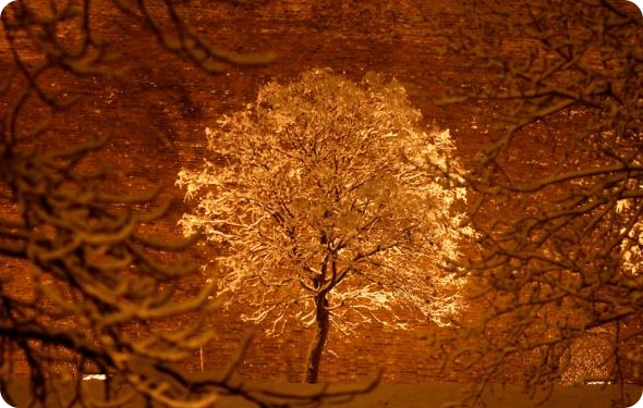 Освещенное сзади заснеженное дерево в Будапеште. (REUTERS/Bernadett Szabo)