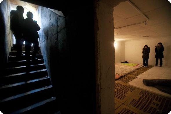 Жительницы южнокорейского острова Енпхендо прячутся в бомбоубежище, после того как власти забили тревогу о возможной атаке со стороны Северной Кореи в воскресенье. (AP Photo/David Guttenfelder)