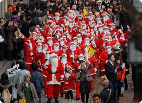 Студенты академии Санта Клаусов идут по знаменитому кварталу Токио Харадзюку. (AP Photo/Itsuo Inouye)