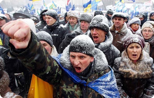 Киевские демонстранты, некоторые из которых в последнее время потеряли работу, во время очередного митинга в знак протеста против предлагаемого нового налогового кодекса. (GLEB GARANICH / Reuters)
