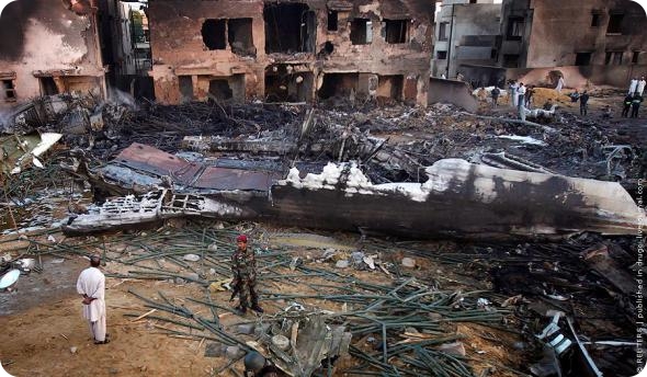 Место падения самолета Ил-76 грузинской авиакомпании Sunways airlines, который вез груз гуманитарной помощи из ОАЭ в Судан (40 тонн палаток). Сразу после взлета самолет упал на жилой квартал в пригородах Карачи и взорвался. Погибли все восемь членов экипажа самолета — россиянин и семь граждан Украины. Есть жертвы и среди местных жителей.