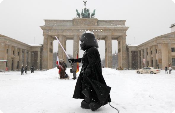 Уличный артист в костюме Дарта Вейдера перед Бранденбургскими воротами во время снегопада в Берлине 2 декабря. (REUTERS/Pawel Kopczynski)