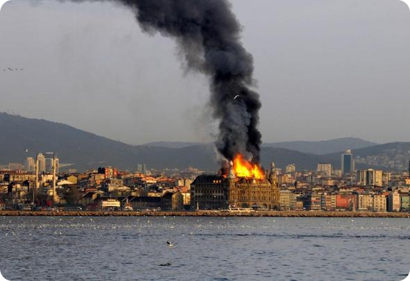 Огонь и дым поднимаются от крыши исторического здания вокзала Хайдарпаса в Стамбуле. Огонь разрушил большую часть крыши здания начала 20-го века и четвертый этаж. Пожар начался во время работ по реставрации здания. (AP Photo)