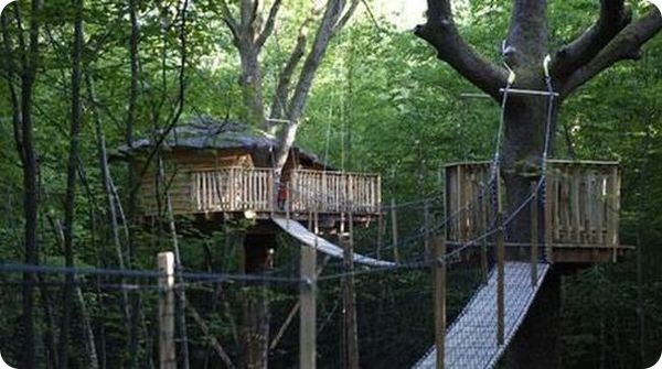 Деревянные домики в Буа-де-Ландри в 90 минутах езды от Парижа построены прямо на дубовых деревьях, и сообщаются между собой системой веревочных мостов и лестниц. Чтобы еще больше слить клиентов с природой, хозяева не стали проводить ни электричество, ни водопровод.
