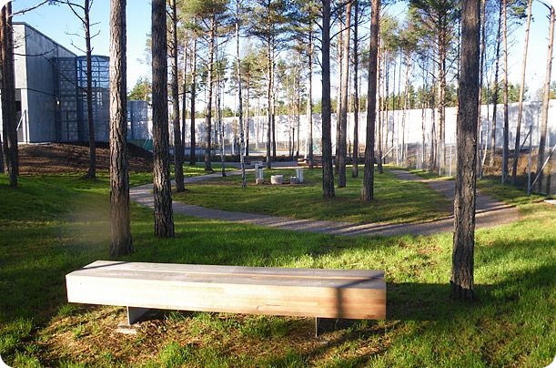 Здания словно бы выросли в лесу, стена, окружающая территорию, заслонена деревьями, обстановка камер точно в хорошем студенческом общежитии: телевизоры-панели, мини-холодильники, окна без решеток.