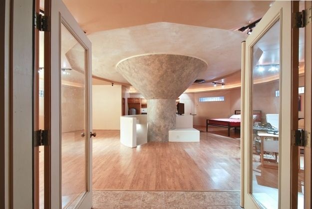 Необычный дом расположен в горах Адирондак на севере штата Нью-Йорк и внешне не отличается от других загородных коттеджей на озере Саранак. Он окружен лесом площадью около 8 гектаров, в котором есть взлетно-посадочная полоса для самолета.