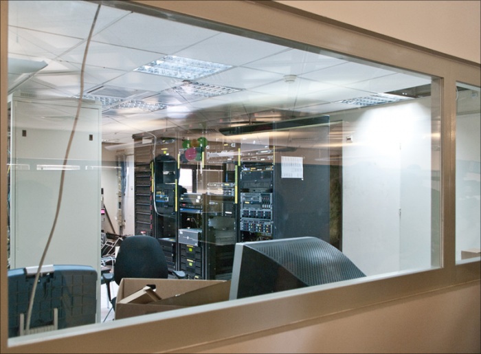35. На этаже есть серверная комната — впервые вижу, чтобы она была за стеклом; обычно всё в отдельной комнате за семью печатями.
