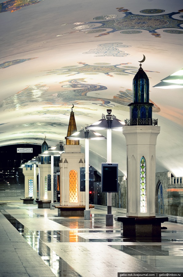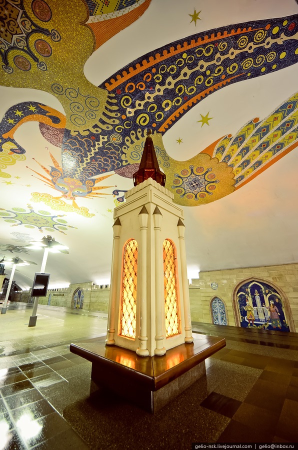 13. На перроне расположены башенки, символизирующие минареты казанских мечетей. На своде можно видеть изображение дракона, по легенде охраняющего город.