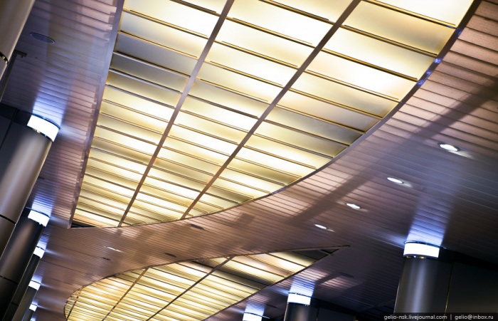 3. Интерьер станции выполнен в стиле хай-тек. Нелинейные колонны и элементы потолка, а также стены станции облицованы композитными, металлокерамическими и прочими современными отделочными материалами.