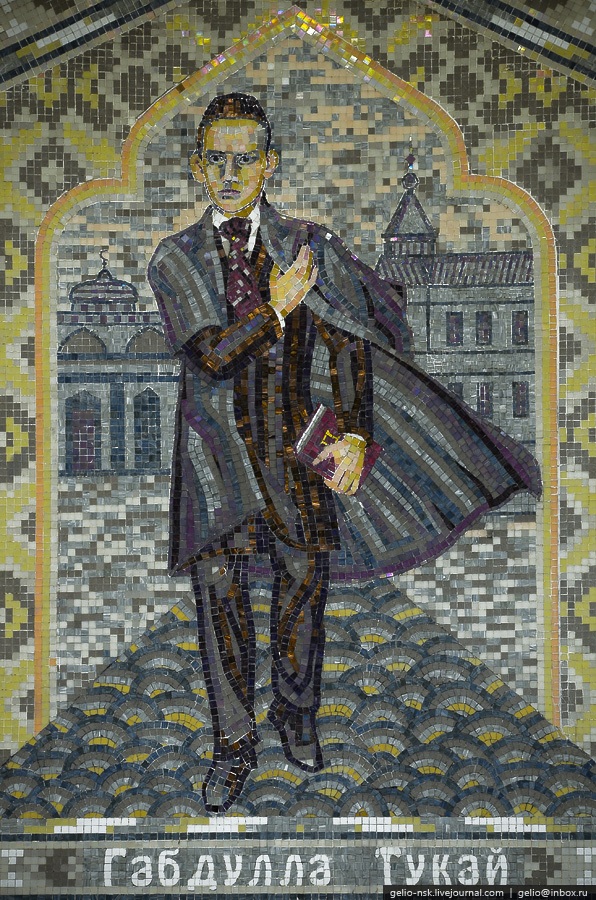 22. На путевых стенах помещены 22 мозаичных панно в технике римская мозаика, изображающие героев сказок и темы произведений Габдуллы Тукая и его портретный образ.