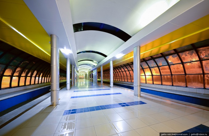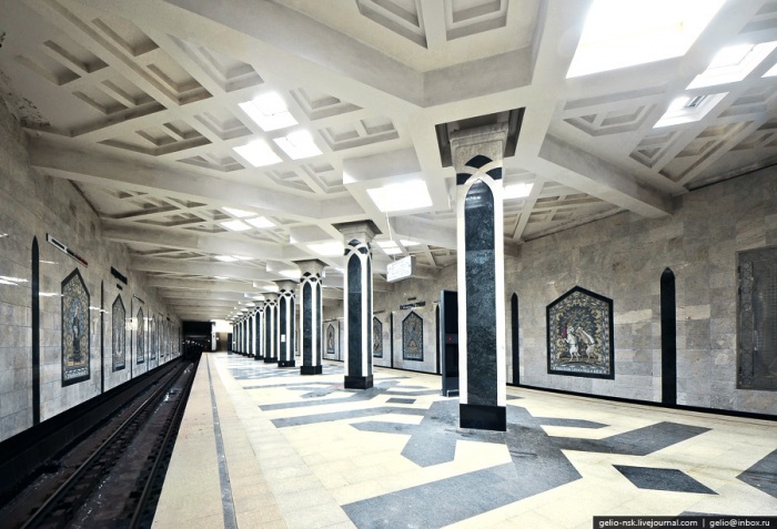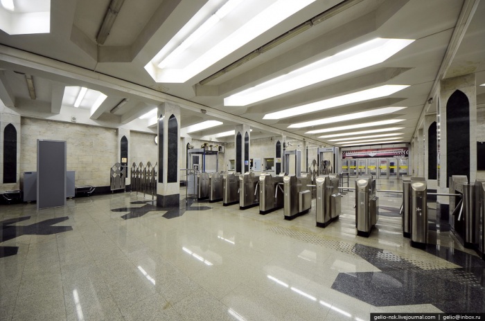 21. Архитектурное решение станции связано с национальным колоритом — преобладают белый и зелёный мрамор. Одиночный ряд колонн (12 колонн), повёрнутые на 45 градусов.