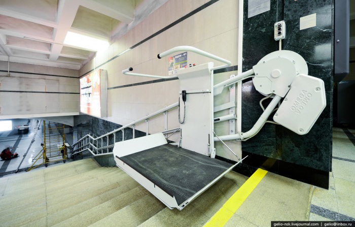 45. Кроме того, в спусках обоих вестибюлей имеется пандус и установлен платформенный подъемно-транспортный механизм, пригодные для инвалидов и других пассажиров с ограниченными функциями.