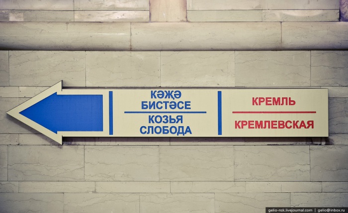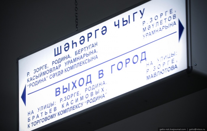 17. Вообще, все элементы навигации в Казанском метрополитене двуязычные (русский и татарский языки). А звуковые сообщения в вагонах даже трехъязычные — русский, татарский, английский.