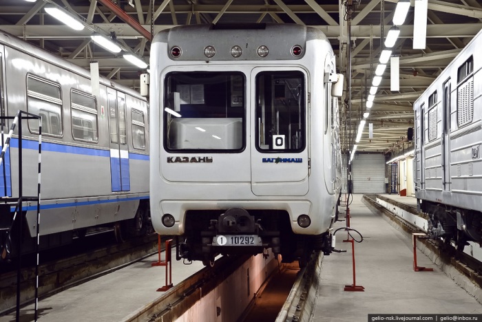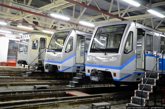 54. Здание депо рассчитано на 82 вагона. Казанский метрополитен использует современный отечественный подвижной состав. Все метровагоны в Казани оснащены асинхронным тяговым приводом, который позволяет повысить надежность и обеспечить экономию электроэнергии.