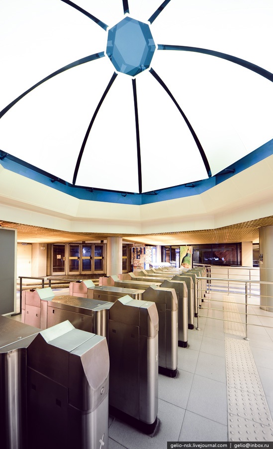 19. Северный вестибюль имеет и естественное освещение — через полусферический стеклянный атриум на поверхности. Южный вестибюль был открыт весной 2006 года, но в связи с низким пассажиропотоком в 2008 году временно закрыт. Его открывают только на День Республики и Города (30 августа)