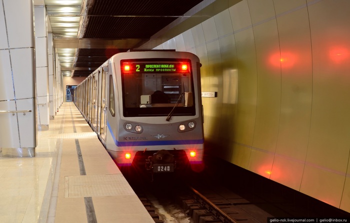 46. Конечная станция — «Проспект Победы». Открыта в 2008 году. Станция колонная, мелкого заложения. Основой интерьера станции является тема Победы СССР в Великой Отечественной войне.